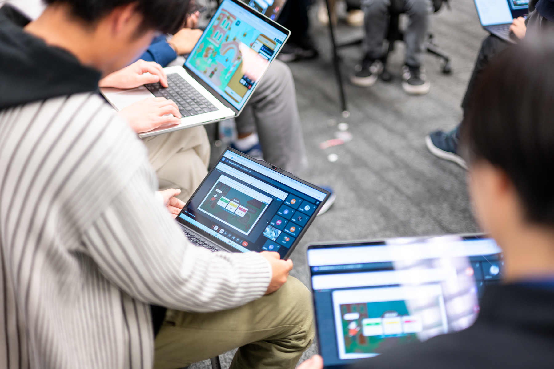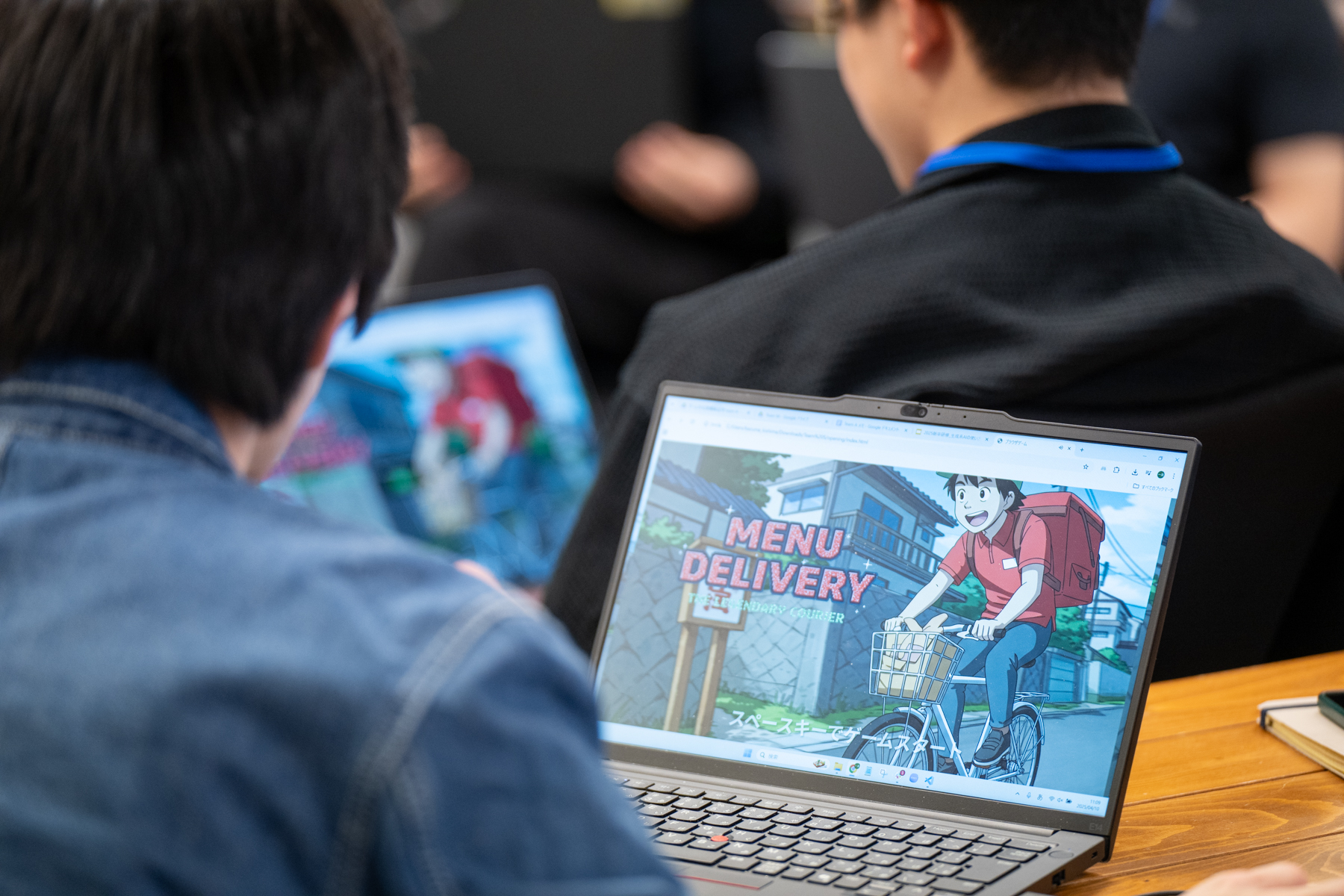 - 第二課題(生成系AIの使い方と注意、生成系AIだけでゲームをつくるプロジェクト): 今年度の研修で特に焦点が当てられたのが「生成AI」です。その使い方や注意点を学んだ上で、実際に生成AIを活用してゲームを創り上げるという挑戦的なプロジェクトにグループで取り組みました。
